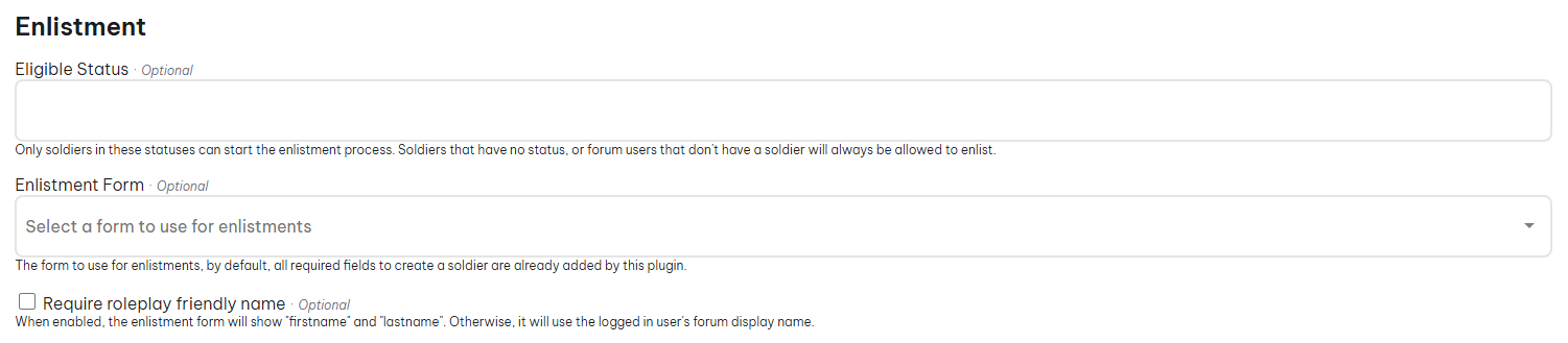 On this page you can modify the plugin's behaviour when it comes to enlistments and if it should automatically post the enlistment in a forum or assign a default role if you want to make your enlistments forum only visible to enlistees and recruiters.