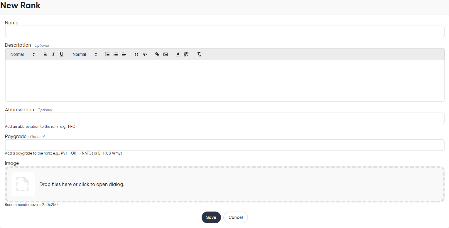 Ranks define authority, responsibility, and progression within your unit. At the moment, ranks are structured in a flat list, meaning there is no categories for them.