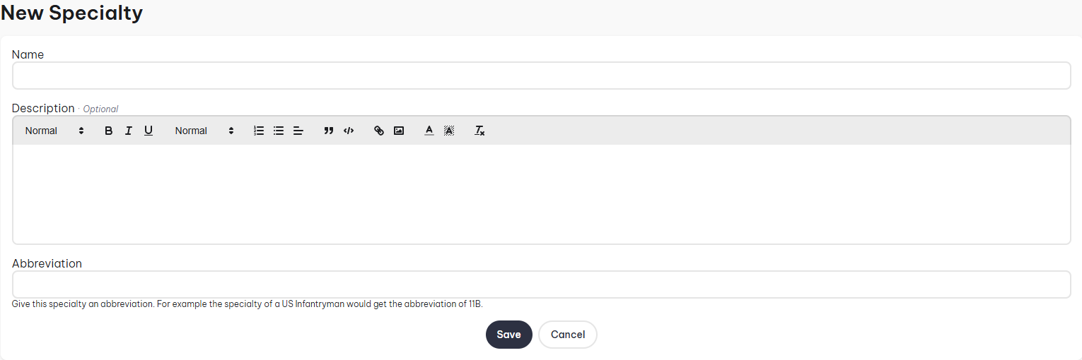 - Description: Brief summary outlining the specialty, could include the requirements for it.
